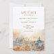 This enchanting save-the-date card features a romantic watercolor illustration of the iconic rooftops and domes of Rome. The delicate blend of warm peach, terracotta, and soft blue hues captures the timeless beauty of the Eternal City, evoking a sense of classic Italian romance. The fine details and artistic style make this card ideal for couples planning a destination wedding in Rome or seeking to bring a touch of Italian charm to their celebration.