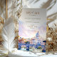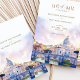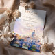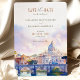 Announce your wedding in style with this elegant "Save the Date" invitation, featuring a watercolor illustration of St. Peter's Basilica and the iconic bridge over the Tiber River in Rome, Italy. Soft shades of lavender, pastel pink, and blue sky create a romantic and artistic ambiance, perfect for a destination wedding. The refined typography and picturesque setting capture the timeless beauty of Rome, giving guests a preview of the unforgettable experience awaiting them. Ideal for couples planning a wedding in the Eternal City.