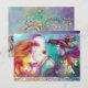 Balcony scene from Romeo and Juilet tragedy by William Shakespeare .Original contemporary watercolor painting with golden foil and iridescent colors in bright purple ,pink,green,yellow orange , teal,turquase, white ..Painting by Bulgan Lumini (c)