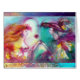 Balcony scene from Romeo and Juilet tragedy by William Shakespeare .Original contemporary watercolor painting with golden foil and iridescent colors in bright purple ,pink,green,yellow orange , teal,turquase, white ..Painting by Bulgan Lumini (c)