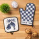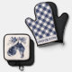 "Rooster" Blue Willow Style Custom Oven Mitt & Pot Holder Set. Introducing our beautiful kitchen oven mitt and pot holder set, featuring a charming blue rooster with flowers on a white background on the pot holder and a gingham pattern on the oven mitt. Inspired by the Willow Blue China Style color palette and style, this piece adds a touch of charm and elegance to any kitchen decor. What sets this product apart is its customization option, allowing you to personalize it with your name or the name of a loved one, making it a thoughtful gift. To complete your kitchen ensemble, we offer coordinating products such as a cutting board, kitchen towel, as well as a wall clock and coffee/tea mug. The best part? The wall art, coffee/tea mug, cutting board, and oven mitt can all be customized to your liking.