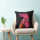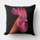 Rooster chicken pillow (black background). Colorful and very detailed. Side profile. Brown feathers. Mesmerizing, captures an audience.