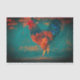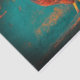 Tissue paper with image of a colorful rooster against a blue brick background.