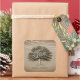 Unique design rustic custom wedding stickers featuring an old oak tree decorated with string of lights and a typographic text phrase which says "Rooted in Love" being placed on top against a faux kraft-textured paper background.