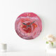Pink, red and rose colored cartoon petals are the background for yellow clock numerals.