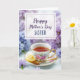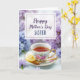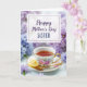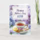 This card features a tall layout that pairs a gentle greeting with a cozy tea-table scene, where the careful arrangement suggests a quiet moment shared between close friends ❤️. Near the top, a bright white rectangle holds the message, with the main line in flowing cursive-style lettering and a supporting line in a classic serif look. The text appears in deep purple and cool blue tones, tying in with the surrounding colors. Below, a porcelain teacup and saucer take center stage, decorated with soft pink and plum rose patterns that feel like a tender gift left for someone special. Thin gold edging highlights the rim and handle, catching the light as if someone just set it down with care. Inside the cup sits an amber-colored drink, adding warmth against the cooler floral background 🌼. A lemon slice rests on the saucer beside a shiny gold spoon, with blurred lavender and blue blossoms filling the backdrop.