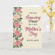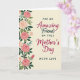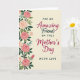 This card features a soft cream background with a tall floral border running down the left side, setting a gentle, affectionate mood ❤️. Along that border, stylized roses bloom in shades from pale blush to coral pink, paired with deep green leaves and thin, dark stems that feel like they’re leaning in close together. The message is centered on the open space to the right, arranged in stacked lines so the eye moves smoothly from top to bottom. “FOR AN” and “ON THIS” appear in small, dark lettering, while “Amazing Friend” and “Mother’s Day” are written larger in a flowing maroon-red style that echoes the deeper rose tones. “WITH LOVE” sits near the bottom in the same dark lettering, like a quiet sign-off that matches the tender look of the clustered flowers 🌼. The overall layout feels balanced, with the florals acting like a supportive arm around the words. Near the lower part of the floral border, a single deep pink tulip bud peeks out between the roses.