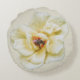 A bumble bee is at the center of this creamy light-yellow colored rose collecting the pollen.