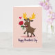 The front design shows a friendly, cartoon-style brown forest animal standing against a blush-pink background, with tall yellow antlers that curl in a stylized way. Its wide eyes and open smile feel like a warm invitation, as if it’s looking at someone it cares about ❤️. One leg lifts slightly while it offers a large deep-red rose, the petals carefully layered, with a green stem and leaves angled toward the viewer. A small red heart floats above its head, adding a gentle romantic touch without needing extra words. Near the bottom, the message “Happy Moosether’s Day” sits centered in flowing black lettering, easy to spot against the pale backdrop. The layout keeps the character and flower in the middle, while the soft pink space around them makes the gesture feel tender and focused. Red accents from the rose and heart stand out against the pastel setting, and the bright yellow antlers add a sunny contrast 🌼. The rose is held forward in the creature’s hoof, with the heart hovering just above its antlers.
