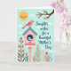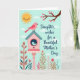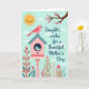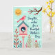 This design shows a garden scene centered on a pink-and-cream birdhouse with light decorative patterning, set on a tall striped post like a sweet little home in spring. A rosy bird stands on the roof looking down with a protective, affectionate tilt, while a smaller teal bird peeks from the round doorway as if answering with quiet trust ❤️. In the upper left, a smiling sun glows against a pale blue sky with soft white clouds drifting by, keeping the mood gentle and friendly. On the right, a slender branch reaches in, dotted with bright pink blossoms that frame the birdhouse like a natural bouquet 🌼. Along the bottom, layered leaves and flowers in earthy tan, coral, and deep green curl and sway, giving the scene a cozy, close-together feeling. A flowing message appears across the open sky area, set in a dark contrasting color that stands out clearly above the birdhouse. The birdhouse doorway is a neat circle, shaded softly, with the teal bird’s face centered inside it.