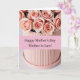 This card features a serene bouquet of blush roses, with petals fading from creamy edges into deeper pink centers that feel gently affectionate ❤️. The flowers sit in a pastel salmon cylinder vase with fine vertical ridges, giving the scene a soft, modern touch. Behind everything is a light gray background that keeps the focus on the tender curls of each bloom. A horizontal band of pale pink runs across the middle, like a quiet ribbon tying the design together. Centered on that band is a short Mother’s Day message for a mother-in-law, set in a dark gray serif style that reads clearly without overpowering the flowers 🌼. The lighting is diffused and calm, bringing out velvety petal texture and mild shadows along the vase. The bouquet rises just above the pink band, with several open roses clustered at the top and a few smaller buds tucked near the sides.