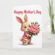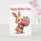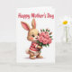 This card shows a tan, rabbit-like character standing front and center on a plain white background, with long ears shaded soft pink inside and wide brown eyes that look outward with a shy, affectionate gaze ❤️. A light blush sits on its cheeks, and a small smile suggests it’s offering something sweet to someone it cares about. The character wears a red-and-white striped shirt and holds a bouquet of pink roses close to its chest, like a gentle gift between close friends or family. The roses include tight buds and fuller blooms, with green sepals and leaves adding contrast around the petals. Soft lighting creates faint shadows beneath the paws and flowers, giving the figure and bouquet a bit of depth without crowding the open space. Near the top, the words “Happy Mother’s Day” appear in red, flowing lettering, centered above the illustration 🌼. The bouquet shows layered pink petals with green accents, and the ears’ inner pink shading stands out against the white background.