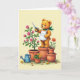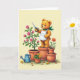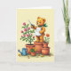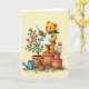 This card features a golden-brown, plush-furred animal-like gardener perched atop a terracotta pot, cheeks softly rosy as it leans in with a tender, content look ❤️. It wears a white apron and a green scarf, holding blue-handled garden shears close to a full rose bush, as if carefully trimming blooms for someone special. The background is a creamy, pale tone with gentle, even lighting that makes the scene feel calm and cozy. To the left, the rose bush rises with deep green leaves and many pink blossoms, creating a romantic focal area beside the character. Nearby terracotta planters add a friendly garden setting, including tall yellow sunflowers and one small orange flower for contrast 🌼. On the lower area, a blue watering can with small white dots sits on a lightly textured, pale green ground, suggesting recent care. Small red seeds and a few scattered yellow petals dot the ground around the pots, with the rose blossoms painted in soft pink layers and leafy shadows.