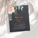 Chalkboard background. Decorated with a rose gold and blush pink floral, rose flower and green watercolored eucalyptus leaves, sprigs, greenery and a faux gold sprig. Personalize and add the name of the bride to be and party details. White and golden colored text.