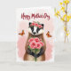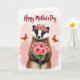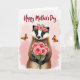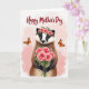 This greeting card features a friendly woodland animal with black-and-white facial markings and soft brown fur, placed front and center and looking outward with a tender, affectionate gaze ❤️. A crown of pink roses and green leaves rests on its head, and it holds a full bouquet of matching blossoms close to its chest, as if offering them to someone special. Two butterflies with orange-and-black wings hover on either side, creating a balanced scene that feels like a quiet shared moment in a garden. The background is a light watercolor wash of pale rose and white, giving the setting a gentle springtime air 🌼. Near the top, a short message appears in flowing red lettering, centered above the animal. The petals are shaded to look soft and layered, while the fur is shown with fine strokes that add warmth without heavy detail. Small touches of greenery peek between the flowers, echoing the leafy crown. The butterflies’ wings show orange panels edged in black with tiny light spots near the tips.