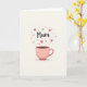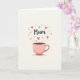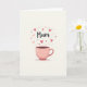 This card features a rounded ceramic mug in a soft rose color, filled with a deep, dark drink that feels like a shared quiet moment ❤️. From the mug’s rim, a trail of hearts rises upward like gentle steam, suggesting closeness and care between giver and receiver. The hearts vary in size and appear in pale pink through deep crimson, with a mix of filled shapes and thin outlines for light contrast. Small scattered dots float among them, adding a soft sparkle without crowding the space. Near the top center, the word “Mum” sits prominently in a charcoal-gray, flowing hand-lettered style, nestled into the heart trail. The text is large and easy to spot, while the rest of the artwork stays airy and calm around it. A creamy off-white background leaves plenty of open space, letting the pinks and reds feel tender and gentle 🌼. The mug sits in the lower portion of the design, with the heart “steam” reaching into the upper half against the pale backdrop.