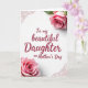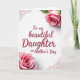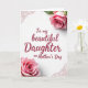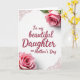 This greeting card features a bright white background with a large red, flowing line of text centered on the front that reads, “To my beautiful Daughter on Mother’s Day.” The lettering sits as the main focus, with generous white space around it to keep the words easy to read. A soft pink rose blooms in the upper right corner, its layered petals shaded from blush to deeper pink, as if leaning in toward the message with a tender, caring feel ❤️. Another matching rose rests in the lower left corner, angled upward so the two flowers seem to quietly mirror each other like close family sharing a gentle moment. A small touch of green leaves peeks out near the top rose, adding a natural accent without overpowering the pale palette 🌼. In the top left and bottom right corners, faint lace-like corner flourishes appear in a very light rosy tint, balancing the roses across the page. The roses have subtle shadows and highlights that give them depth against the white background, while the delicate corner patterns remain soft and airy.