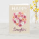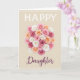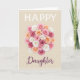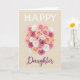 This greeting card features a round, full bouquet of roses arranged like a soft wreath, with creamy white, blush pink, warm peach, and deep fuchsia petals nestled closely together. The flowers sit centered on the front, creating a gentle, affectionate focus that feels like a hug in bloom ❤️. Near the top, the word “HAPPY” appears in white, with classic letter shapes that stand out clearly against the background. Below the bouquet, “Daughter” is written in a flowing style in a deep plum color, adding a tender, close-to-the-heart touch without needing extra decoration. Soft, even lighting smooths the scene and brings out the layered textures of each petal, like a quiet moment shared between loved ones 🌼. A subtle double-line frame surrounds the design, keeping everything neatly contained and balanced. The background stays calm and understated so the pastel roses and the plum lettering remain the main focus, and the border lines sit evenly along the edges.