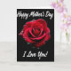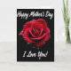 This card features a deep crimson rose centered on a solid black background, drawing your eye straight to the flower’s romantic curl of petals ❤️. Soft, focused lighting traces each velvety fold, giving the bloom a gentle glow that feels like a quiet, affectionate moment shared in the dark. Tiny water droplets rest across the petals, sparkling as they catch the light and adding a fresh, just-misted look 🌼. The overall scene stays simple and dramatic, with the rose’s rich red standing out strongly against the dark space around it. “Happy Mother’s Day” appears near the top in white lettering, spaced clearly above the flower so it reads first. “I Love You!” sits near the bottom in matching white lettering, balancing the layout and framing the rose from below. The rose’s petals spiral inward, with glistening droplets scattered most densely along the upper-left edges.