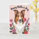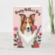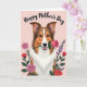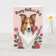 This greeting card features a long-haired, tri-colored dog with warm brown patches, bright white fur, and darker markings around its attentive eyes and pointed ears. The pup faces forward with a gentle, almost smiling look that feels like a friendly, affectionate offering ❤️. A single pink rose rests between its lips, the curled petals carefully detailed like a small romantic gesture. A fluffy white ruff spills down the chest, contrasting with the slightly more textured fur on the face. Behind the dog, the background stays a soft blush pink that keeps the scene tender and calm. On both sides, clusters of flowers and leafy stems in fuchsia, crimson, and lavender rise upward, forming a garden-like frame with a cozy, close-to-you mood 🌼. Near the top, a flowing black message sits centered above the dog, standing out clearly against the pale backdrop. The rose is a bright pink accent right at the center, angled slightly upward from the dog’s mouth.