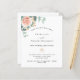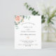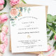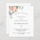 A chic white background. Decorated with a rose gold and blush pink floral, rose flower and green watercolored eucalyptus leaves, sprigs, greenery and a faux gold sprig. Personalize and add your names and the details. Black and green letters.
