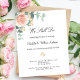A chic white background. Decorated with a rose gold and blush pink floral, rose flower and green watercolored eucalyptus leaves, sprigs, greenery and a faux gold sprig. Personalize and add your names and the details. Black and green letters.