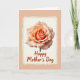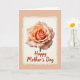 This design shows a single large rose in soft peach and creamy coral tones, placed high on the card like a gentle centerpiece ❤️. The petals curl inward with a slightly deeper shade at the center, and the outer layers open out in a way that feels like a quiet embrace between close loved ones. Fine petal lines and velvety shading add depth, with light falling softly across the curves to create calm highlights and tender shadows. The flower sits inside a parchment-toned rectangle with rough, torn-looking edges, giving the layout a cozy, old-fashioned touch. Behind that inner frame, the background stays a muted peach, keeping everything warm and soothing 🌼. Beneath the rose, the words “Happy Mother’s Day” appear centered in a flowing cursive-style font, colored in an earthy red-brown. The text sits comfortably in the lower part of the framed area, leaving airy space between the message and the bloom. The rectangular insert has an uneven border that looks lightly distressed against the smooth peach field.