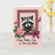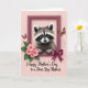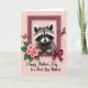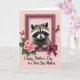 At the center of the card is a masked woodland creature peeking from inside a textured deep rose frame, its front paws resting on the edge as if reaching out with a gentle, friendly curiosity ❤️. Its bright blue eyes and softly blended fur with dark face markings draw you in, like a quiet moment of connection. The background is a soft pastel pink with even lighting that gives the scene a calm, affectionate tone. On the left side of the frame, a cluster of small pink blossoms and fresh green leaves drapes downward, adding a sweet, garden-like touch 🌼. On the lower right, a deep maroon satin-style bow sits neatly, balancing the floral detail with a cozy, romantic accent. Two patterned butterflies in coral and black hover nearby, and one leaves a dotted trail that curves lightly through the air. A flowing cursive-style message is placed along the bottom in a dark maroon color, centered beneath the frame. The frame’s edges show subtle texture, with blossoms on the left, the bow on the right, and the butterflies floating against the pale pink backdrop.