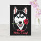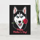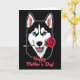 This design shows a front-facing portrait of a northern, wolf-like dog centered on a deep black background, drawn in sharp black-and-white fur shapes that feel soft to the eye. Its upright ears and steady posture give it an attentive look, while the bright blue eyes meet yours with a gentle, affectionate gaze ❤️. A small smile lifts the muzzle, and a touch of pink tongue peeks out, adding a friendly, companionable mood. Held carefully in its mouth is a single deep red rose, the green stem angled slightly downward as if offered like a quiet romantic gesture. The strong contrast between the dark backdrop and the light fur makes the rose stand out as the main splash of color, like a little flourish of devotion 🌼. Below the dog, the words “Happy Mother’s Day!” appear centered in soft pink lettering, sitting neatly under the chin to balance the composition. The rose’s petals look full and layered, with the stem crossing the mouth line in a tidy diagonal.