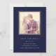 Simple, chic, and feminine; this save the date design uses deep navy blue and white text, with a shimmery faux rose gold border, to set a romantic tone. Minimal typography ensures guests know that the wedding will be formal, while providing all details through the wedding website.