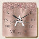 Rose Gold - Blush Pink Glitter Metal Monogram Name Square Wall Clock