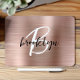 This elegant personalized mouse pad features a monogram and first name in modern black and white script on a trendy rose gold brushed metal background.