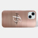 This elegant personalized phone case features a monogram and first name in modern black and white script on a trendy rose gold brushed metal background.