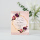 A romantic and glamorous wedding invitation postcard. A faux gold geometric frame with watercolored feathers and florals in burgundy, pink and rose gold. A rose gold, blush pin gradient background, decorated with rose gold faux glitter bands. Personalize and add your names and wedding details. Golden letters. The names are written with a modern hand lettered style script.