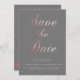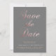 Elegant and stylish simple calligraphy invitation with rose gold twist. Modern layout with custom script "save the date" in rose gold with modern font for all information and rose gold border at the bottom on a gray background