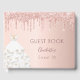 A guest book for a girly and glamorous Sweet 16, 16th birthday party. A rose gold gradient background with rose gold drips, paint dripping look. Decorated with a dress, gown. The text: The name is written in dark rose gold with a modern hand lettered style script. Personalize and add name.
