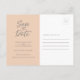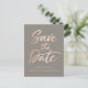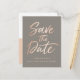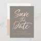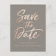 These Save the Date postcards feature an elegant script font in a faux foil look rose gold and gray color palette.