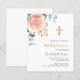 Rose gold and blush pink florals, eucalyptus greenery and a golden cross. Personalize and add a name and details.