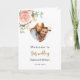 Welcome text, photo, program, menu and a thank you note on the back. Decorated with rose gold flowers, roses and eucalyptus greenery.
