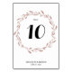 Rose gold foil effect wedding table numbers with floral wreath and custom text printed on white background
