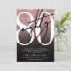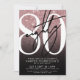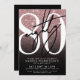 Pink and Black Rose Gold Glitter 80th Birthday Party Invitation. Celebrate eighty in style with this bold and chic design. The top half features a large white “80” with a sassy handwritten black script “Eighty” layered over it, standing out against a faux rose gold glitter background that fades into a sleek black gradient. The bottom portion is solid black with party details in a clean sans serif white font for a modern and striking look. Colors for the fonts and background can be customized to fit your theme.