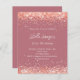 For an elegant 21st (or any age) birthday party. A rose gold background. Decorated with faux glitter. Personalize and add a name and party details. The name is written with a hand lettered style script.
