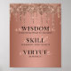 Enjoy this elegant design featuring the motivational quote "Wisdom is knowing what to do next, skill is knowing how to do it, virtue is doing it" set in modern script typography with chic and sparkly rose gold copper glitter drips over a rose gold foil background.