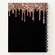 This stylish custom notebook features a glamorous, girly design on a black background. Rose gold glitter sequins are dripping across the top portion. Monogram initials are placed beneath the glitter, followed by a sample name printed in an elegant script font. The back of the notebook features a matching rose gold background with glitter drips.