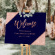 Rose Gold glitter color block typography on customizable navy blue and faux rose gold geometric stripes chic wedding welcome , perfect for elegant, luxurious wedding,