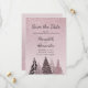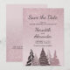 Our Winter Wonderland holiday Save the Date card features rose gold pink glitter blending with a pale rose background in a unique elegant ombre design. Overlaid are five Christmas trees in shades of blush and rose gold, with colors selected from the glitter itself. You can revise the text very easily on front and back of the card using the personalization template.