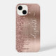 Custom elegant and girly iPhone case featuring dripping rose gold faux glitter on a rose gold faux brushed metallic background. Personalize with your name in a stylish trendy white script with swashes.