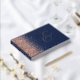 This elegant wedding guest book features a rose gold faux glitter border on a navy blue background. Easily customize the real rose gold foil text, with the names of the couple in whimsical handwriting calligraphy over a large ampersand. Add additional text of your choice to the front and spine.