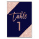 rose Gold typography on customizable navy blue rose gold glitter color block, and faux rose gold geometric stripes chic table number wedding , perfect for elegant, beach wedding,