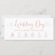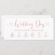 Modern rose gold and white wedding day timeline cards feature a stylish typography design with wedding day event icons, timing information, chic calligraphy script, and heart accents. The simple and elegant custom text that can be completely personalized with the bride and groom names, wedding date. and timeline details.